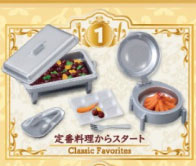 ホテル自慢の豪華料理が食べ放題! ホテルビュッフェをモチーフにしたミニチュアフィギュアです。豪華料理が勢揃い!トングを使ってお皿に好きな料理を盛り付けて遊ぶこともできます!