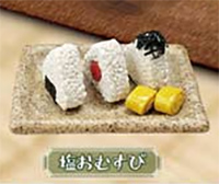 人気の和食ミニチュアシリーズ、今回はおむすびです。 和風ファーストフードとして、あらためて見直されてる”おむすび”が登場!お皿は本物の陶器を使用。